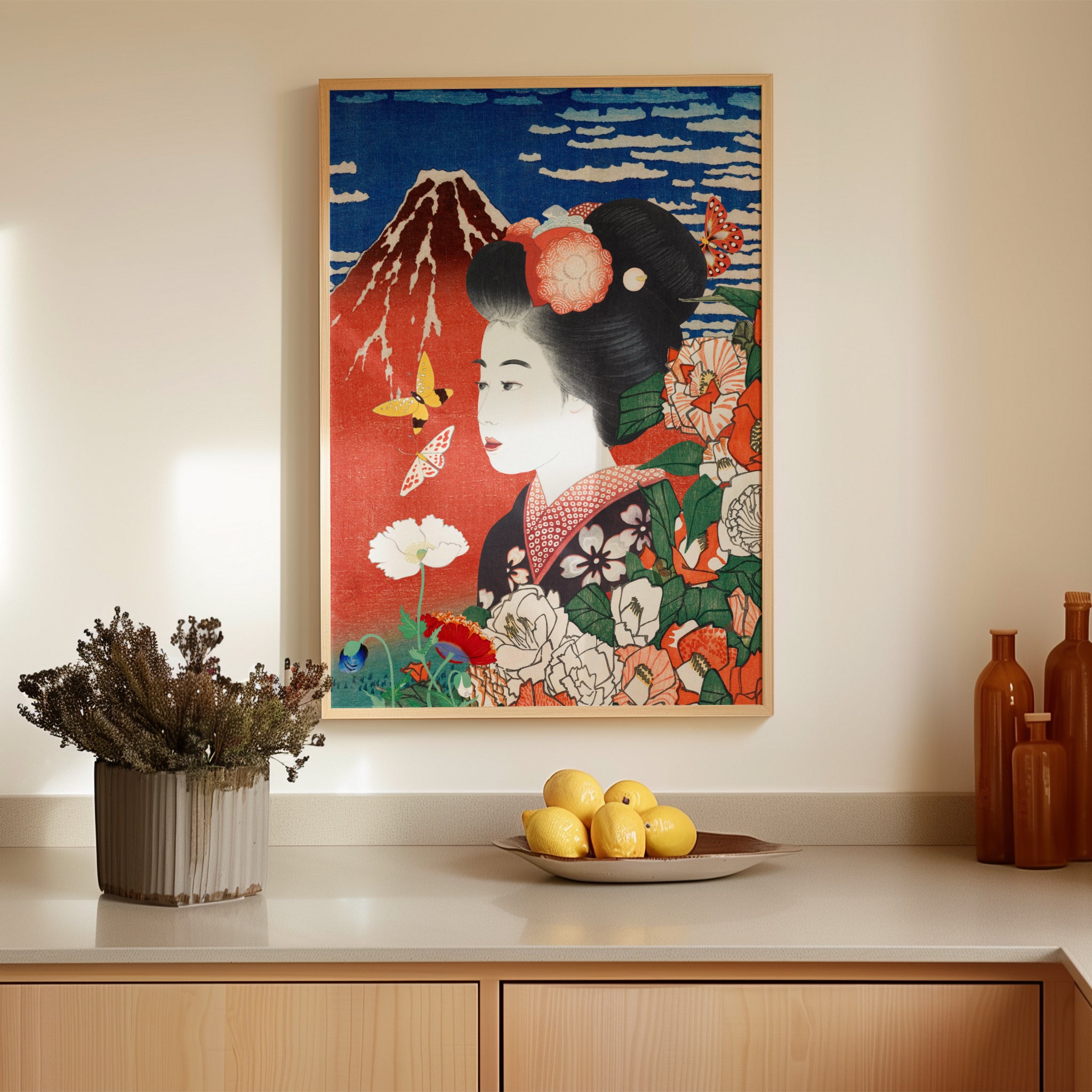 Designed to elevate a space rather than overwhelm it, this print is especially loved in Japandi, Japanese vintage, eclectic modern, and minimalist interiors. It adds warmth, culture, and story to living rooms, bedrooms, studios, and curated gallery walls. The layered symbolism — nature, femininity, landscape — invites viewers to pause and look closer every time.
