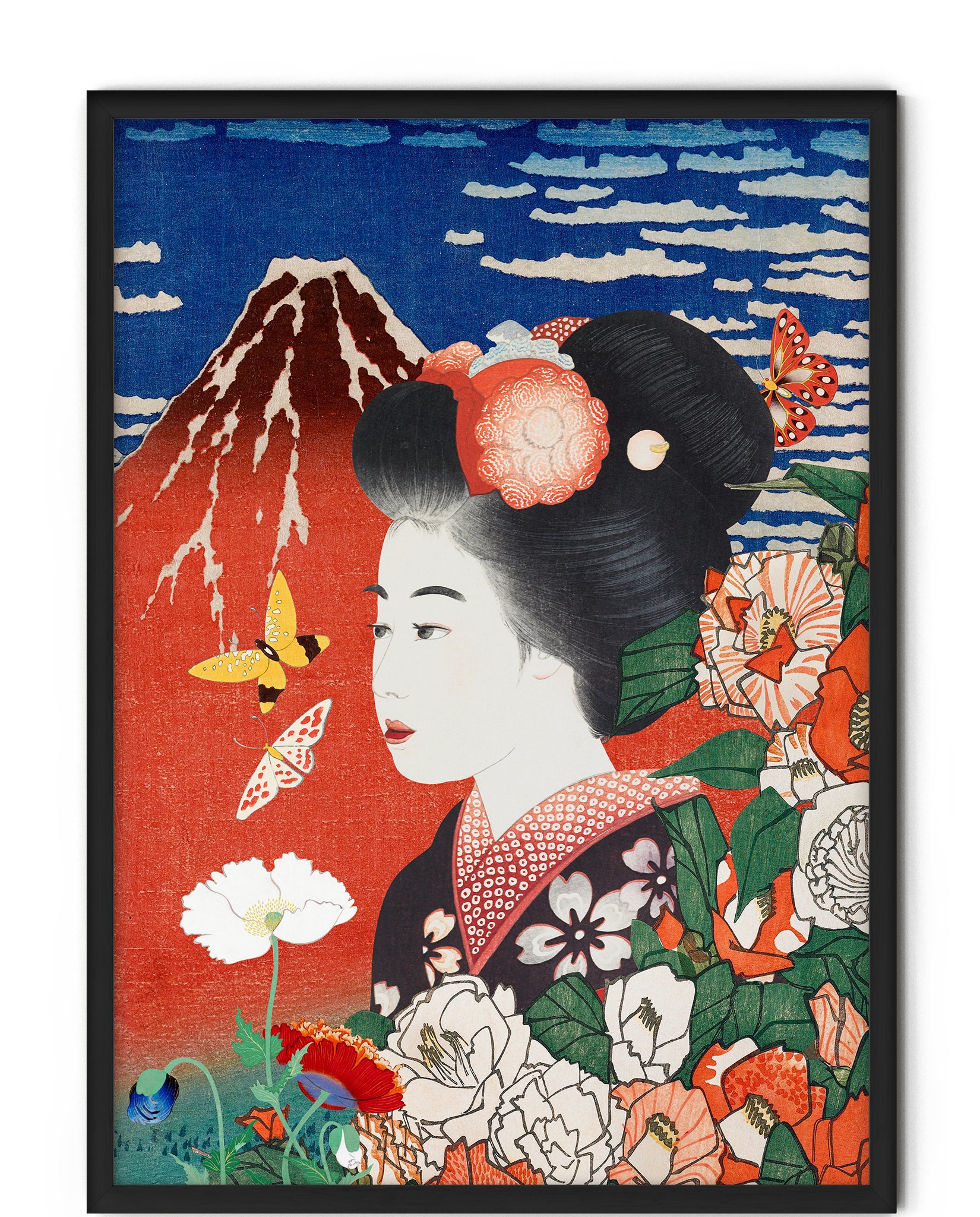 This artwork feels like a moment suspended in time. A serene geisha portrait emerges among blooming florals, drifting butterflies, and the quiet presence of Mount Fuji — a composition rooted in traditional Japanese ukiyo-e aesthetics, yet strikingly modern in its balance and colour harmony. The rich indigo sky, warm vermillion tones, and delicate linework create a visual rhythm that feels both poetic and powerful.