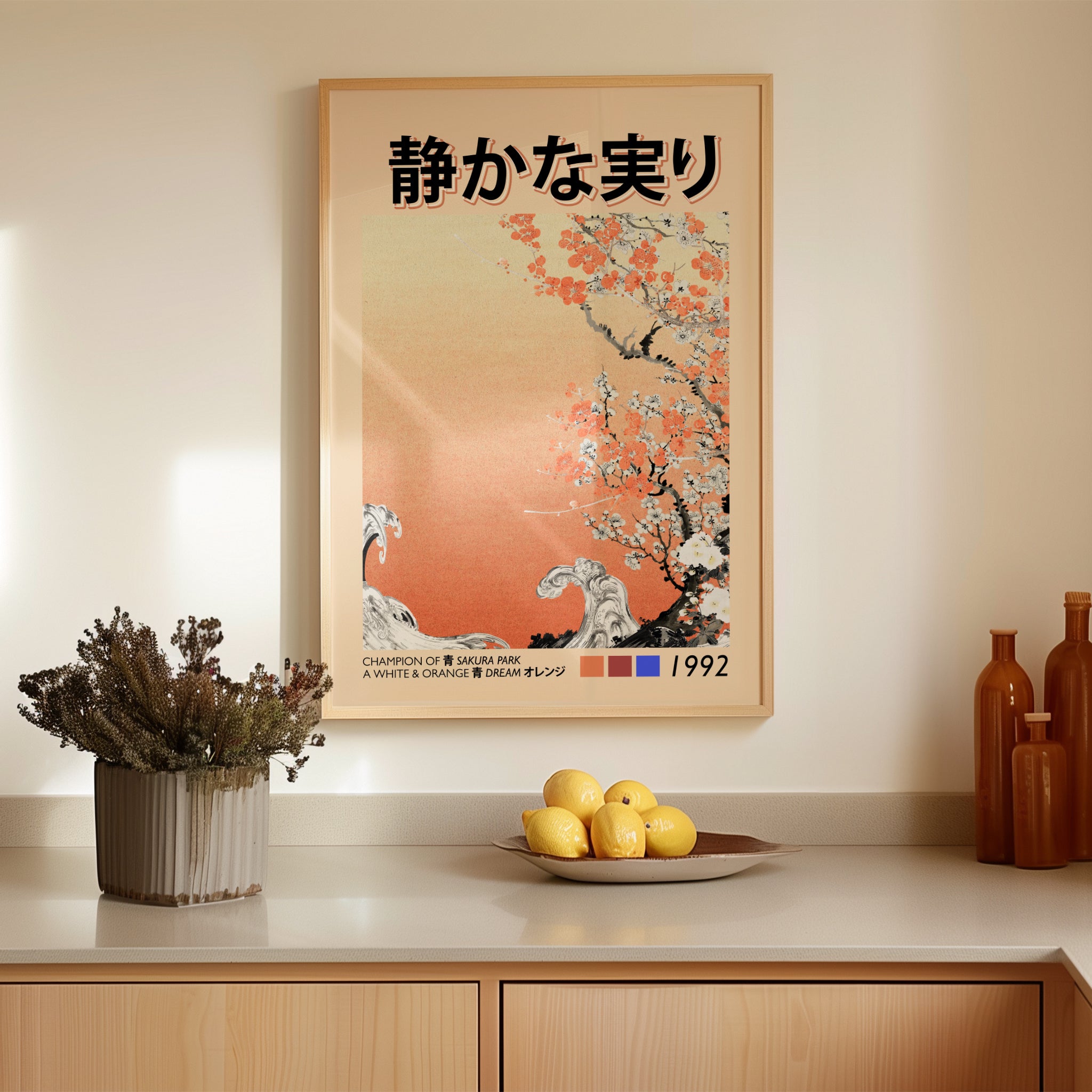 Designed with Japandi and modern Japanese interiors in mind, this print brings warmth without heaviness. The muted orange gradient, ink-style florals, and open negative space allow it to breathe on the wall — perfect for bedrooms, reading corners, studios, or minimalist living spaces where calm energy matters. It pairs beautifully with natural wood, linen textures, and neutral palettes.