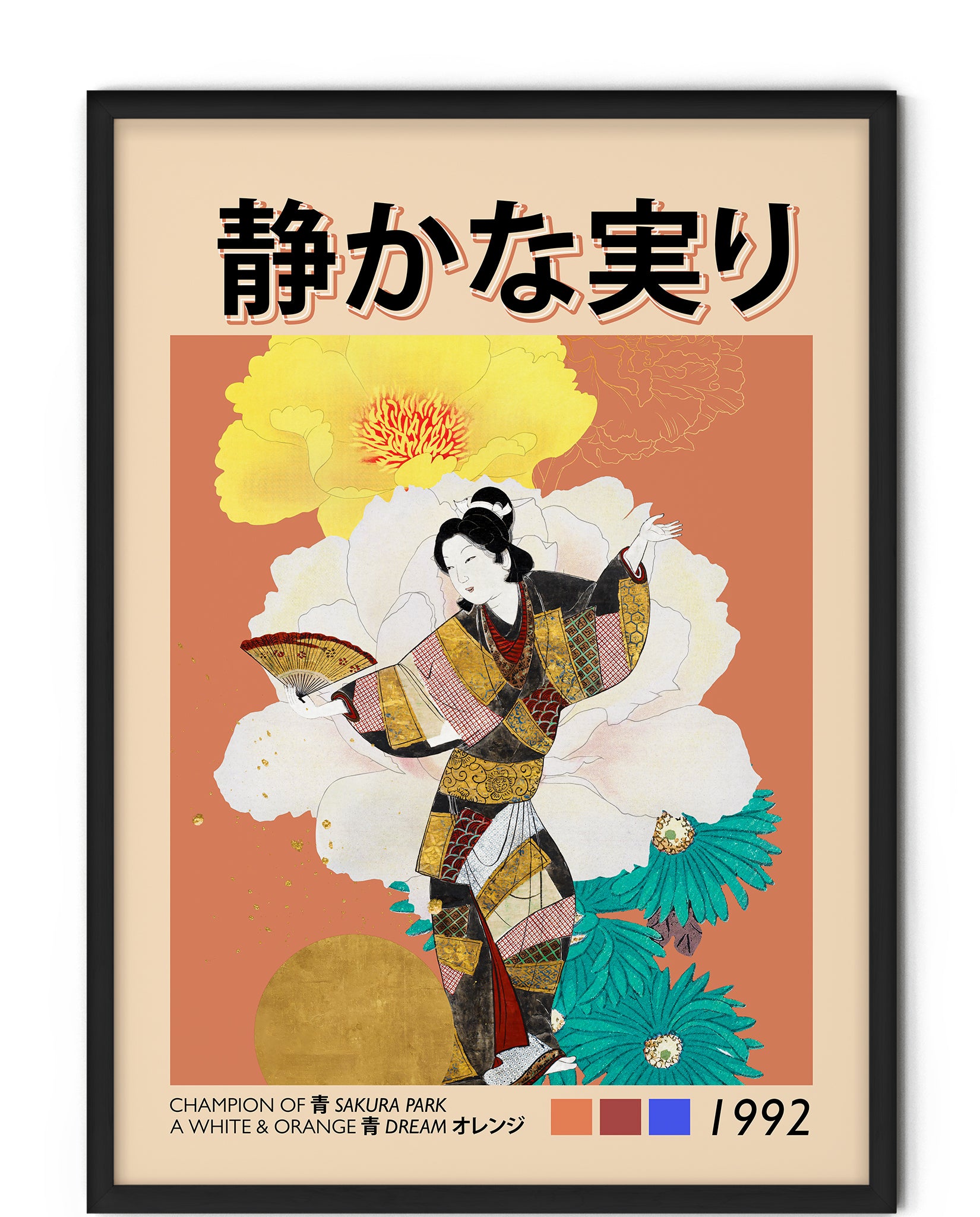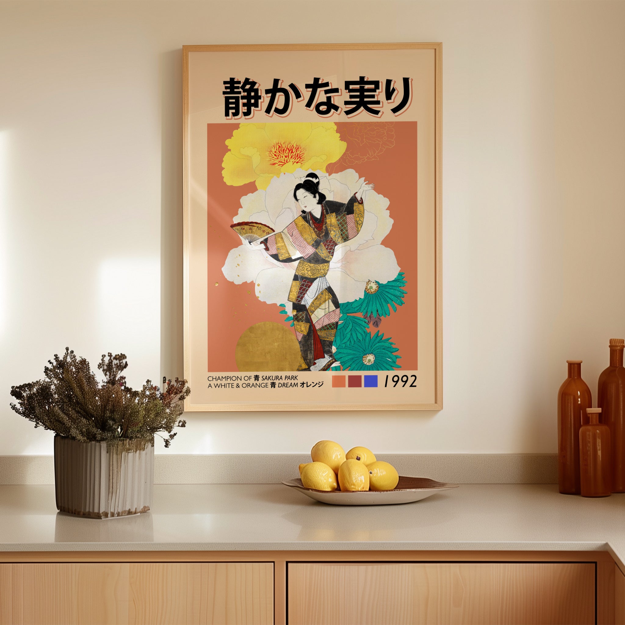 On the wall, this print becomes a focal point without feeling heavy. The soft orange backdrop, layered florals, and refined detailing make it ideal for Japandi, Japanese vintage, eclectic modern, and curated minimalist interiors. It brings warmth, culture, and rhythm to living rooms, bedrooms, studios, and gallery walls — especially spaces styled with natural textures and thoughtful restraint.