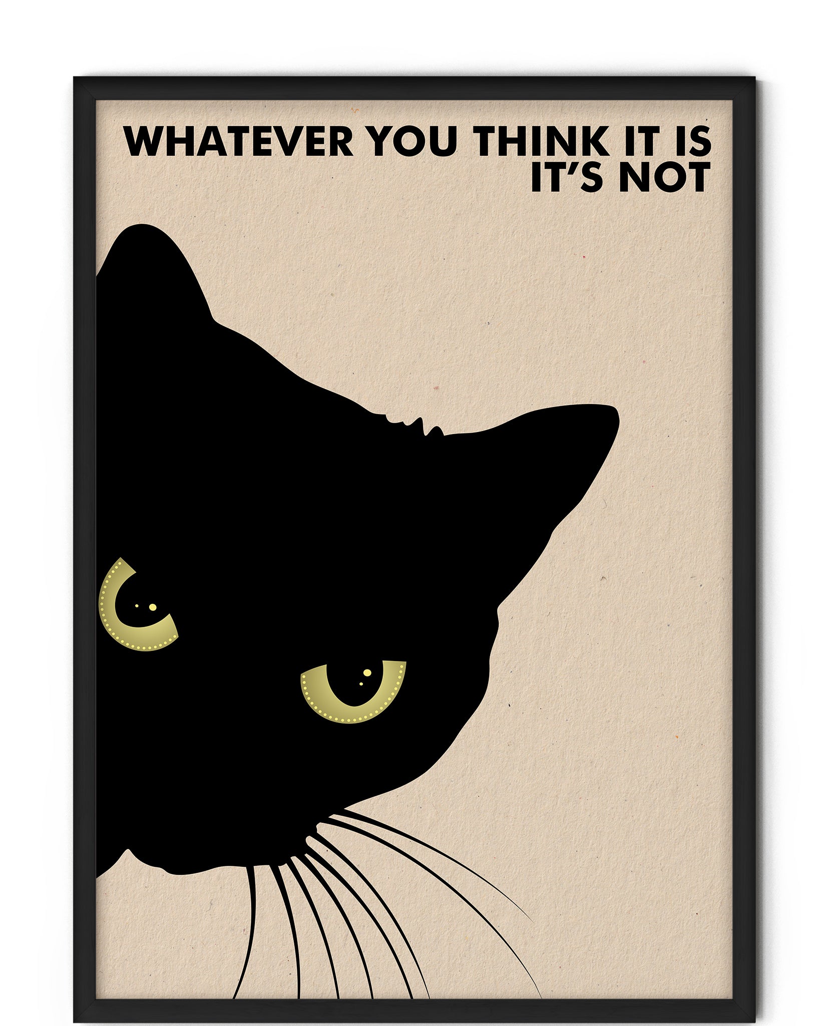 This bold minimalist print plays with perception, ambiguity, and quiet tension. A black cat silhouette emerges from textured paper, its luminous eyes cutting through the negative space while the statement above challenges assumptions.