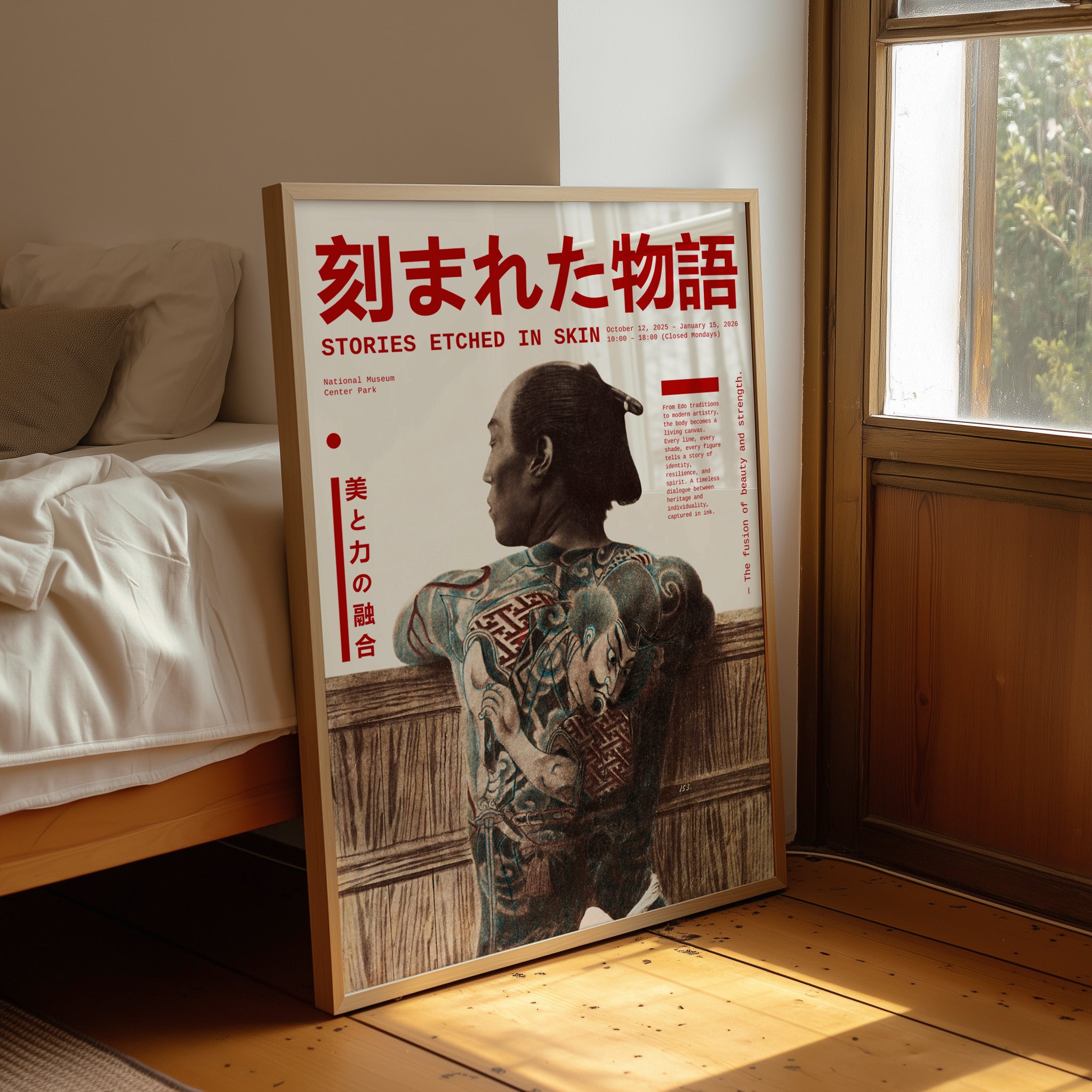 This artwork tells a story etched into time. A tattooed figure stands in quiet reflection, their back covered in intricate Japanese imagery — dragons, symbols, and flowing lines that speak of identity, strength, and lived experience. Paired with bold Japanese typography and exhibition-style layout, the piece feels like a museum poster frozen between past and present.