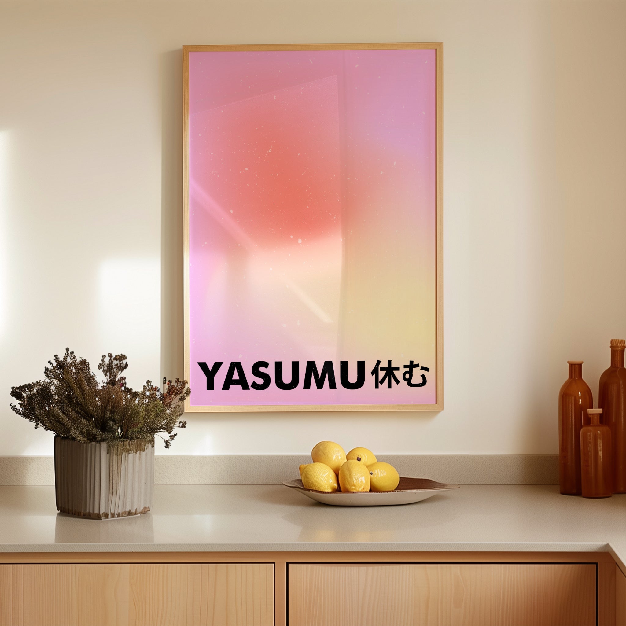 This minimalist typography print pairs bold black lettering with a soft pastel gradient background, creating a visual moment of calm and quiet intention. Inspired by Japanese design philosophy and modern wellness culture, this artwork is designed to slow the room down — gently.